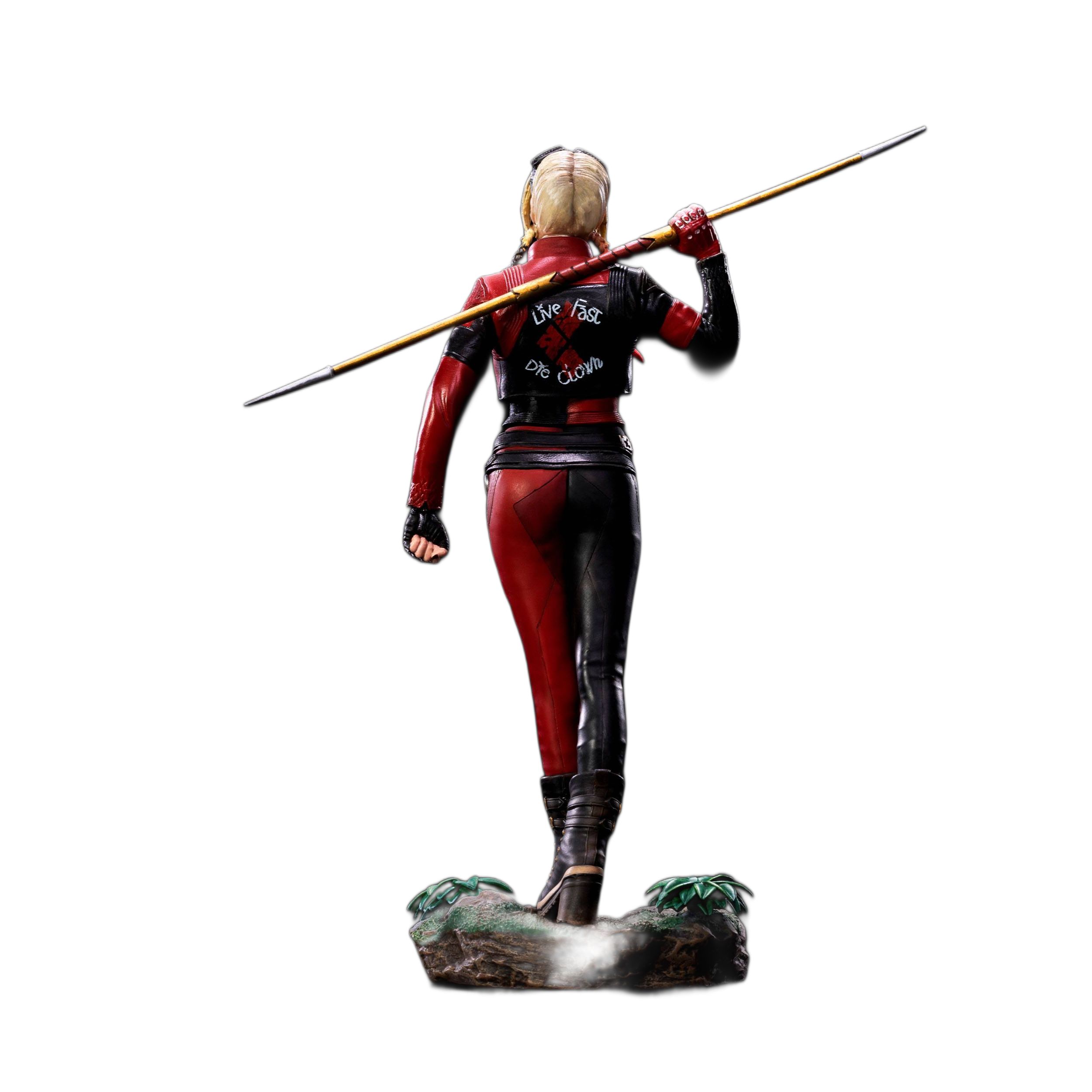 C hoosing a new costume made of red and black leather, and a short jacket with the “Live Fast Die Clown” slogan in the back (a provocation to her exboyfriend Joker), dressing pants with the geometric diamond print just like in the deck suits (a replicated feature from her original costume) and adding a buckle with her initials, a pair of aviator glasses over her braided hair, she continues to walk and smile on a pedestal of the wild terrain from the fictional island of Corto Maltese, carrying on her right shoulder the big javelin given to her by the villain and former German Olympic athlete Javelin right before he died, considering her to be the best person to carry it, but leaving Gotham’s Maid of Mischief confused about its purpose. Adding to their line of statues from The Suicide Squad, Iron Studios present “Harley Quinn – The Suicide Squad – BDS Art Scale 1/10” in another future release.
